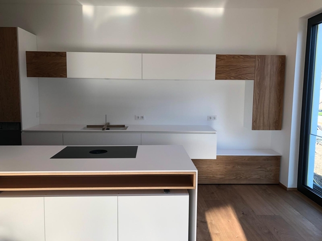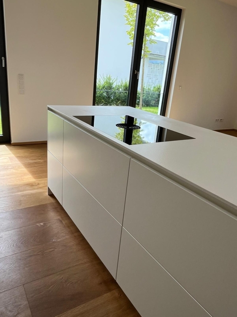 Die Echtholz-Parkettdielen wurden mit in den halboffenen Küchenbereich gelegt, der mit einer hochwertigen, eigens von einer Traditionsschreinerei angefertigten Einbauküche ausgestattet ist.
